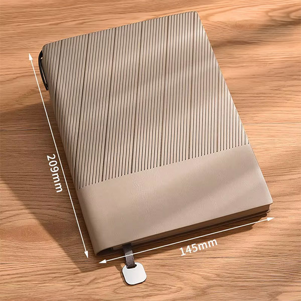 Cuaderno con portada texturizada en color beige, y hojas de rayas.