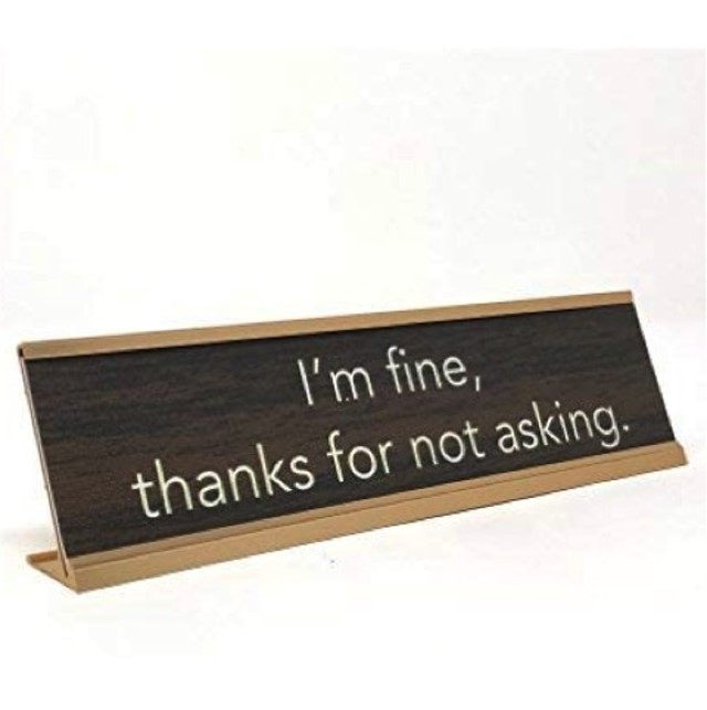 Placa de escritorio elaborada en metal, en color dorado con cobertura de falsa madera y frase en letras blancas “I’m Fine Thanks For Not Asking”.