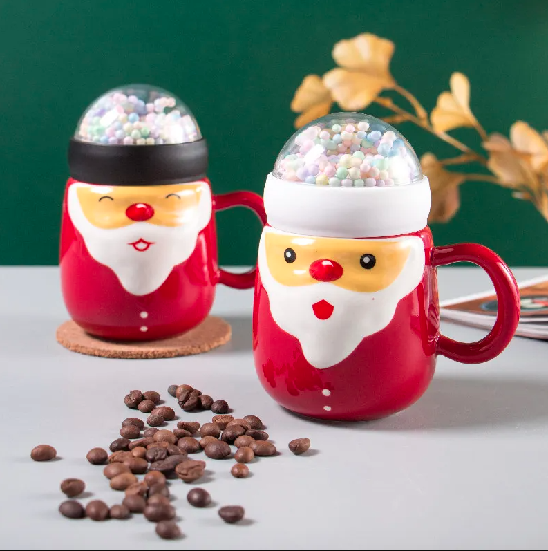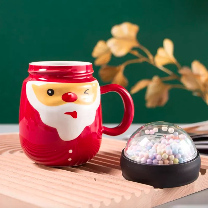 Taza de cerámica con santa y tapa con globo de acrílico y confetti.